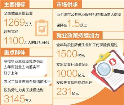 看主要指标,全国城镇新增就业1269万人,超额完成1100万人的目标任务;全年全国城镇调查失业率平均值为5.1%,比上年平均值下降0.5个百分点,就业目标任务圆满完成。