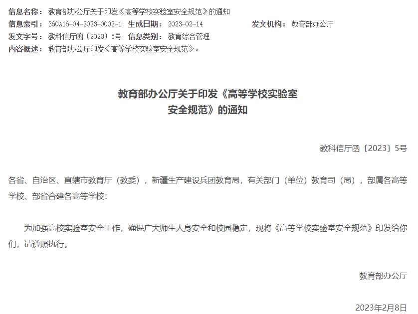信息名称:教育部办公厅关于印发《高等公司实验室安全规范》的通知。