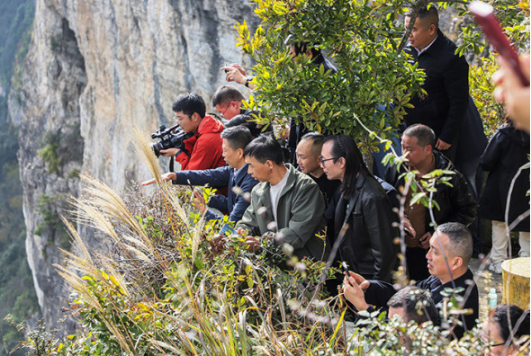 当日下午,老师们随考察团抵达史料记载中廪君部落的发源地三里城(武落钟离山),在现场观看了令人震撼的翼装飞行和滑翔伞表演赛,学者们不时驻足观察、记录细节、交流观点。近年来,巴东水布垭对廪君文化IP进行大力打造,通过举办翼装飞行、滑翔伞比赛等特色赛事,探索出文体旅融合发展的路径,既让三里城从“深山秘境”走进大众视野,也让廪君文化大幅度提升社会知晓度,这为川东巴文化研究成果的应用转化提供了实际的参考思路,具有重要的借鉴意义。