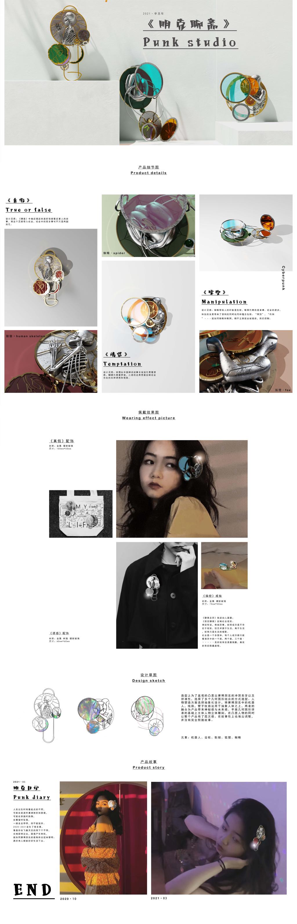 课题研究摘要:该课题主要以赛博朋克风为研究对象,探索其风格元素在中式首饰设计中的创新应用,通过收集整理赛博朋克风运用在各个领域中的实例,分析其产品特点,在对赛博朋克风艺术特征进行分析的基础上,探讨分析其与中式首饰融合的可行性与方法。终确认采用赛博朋克风元素与中式元素融合,辅以常见的中式首饰应用的材料,配色与故事性相结合,有效避免西化的同时,让中式首饰在融合了赛博朋克风格元素后能更好的适应年轻人的审美需求,打造作品《朋克聊斋》。