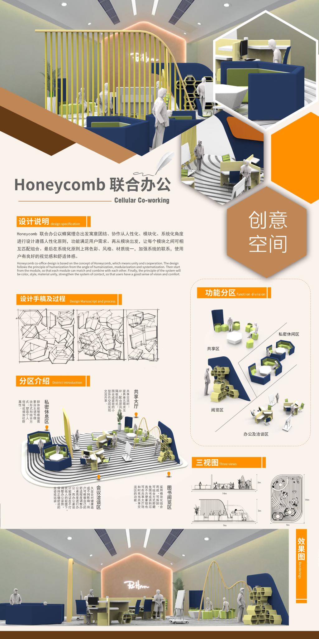 Honeycomb·联合办公以蜂窝理念角度切入寓意团结、协作。从人性化、模块化角度进行设计遵循人性化设计原则,功能满足用户需求。再从模块化出发让每个模块之间可相互匹配组合。最后在系统化原则上将色彩、风格、材质统一,加强系统联系,使用户有良好的视觉感和舒适体感。