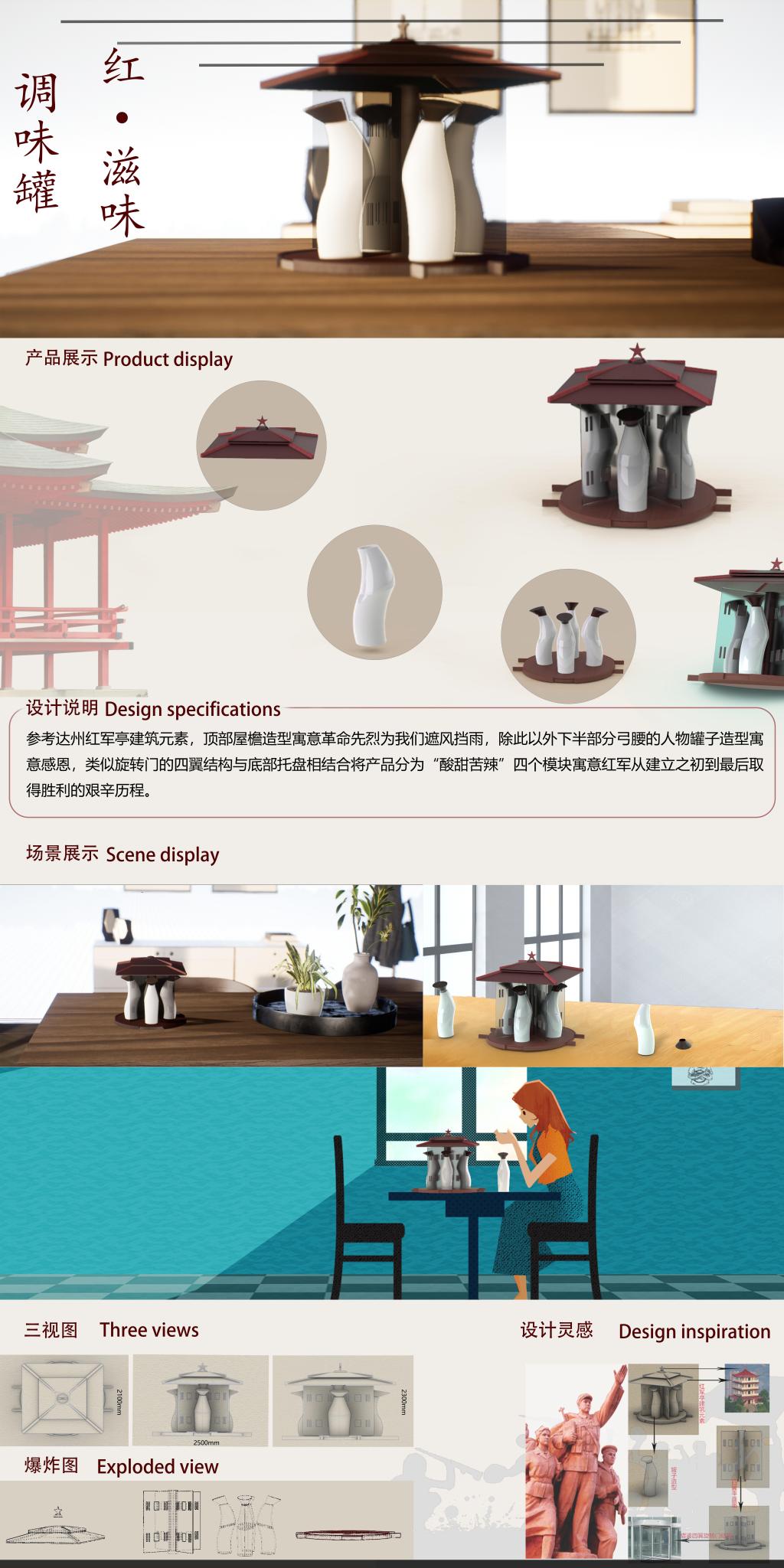 课题研究摘要:文章从文创产品的阐述出发结合情感化设计三层次理论对文创产品进行分析研究,总结归纳出文创产品在情感化设计理论各层次中的设计要素。最后以毕业创作《红·滋味》调味罐设计为例进行实践论证。通过对达州特有红色文化的资料搜集和实地考察,对其元素进行提取与再设计,得出了达州红色文创产品在情感化设计中各层次所对应的设计要素,以此推动达州红色文化的传播。