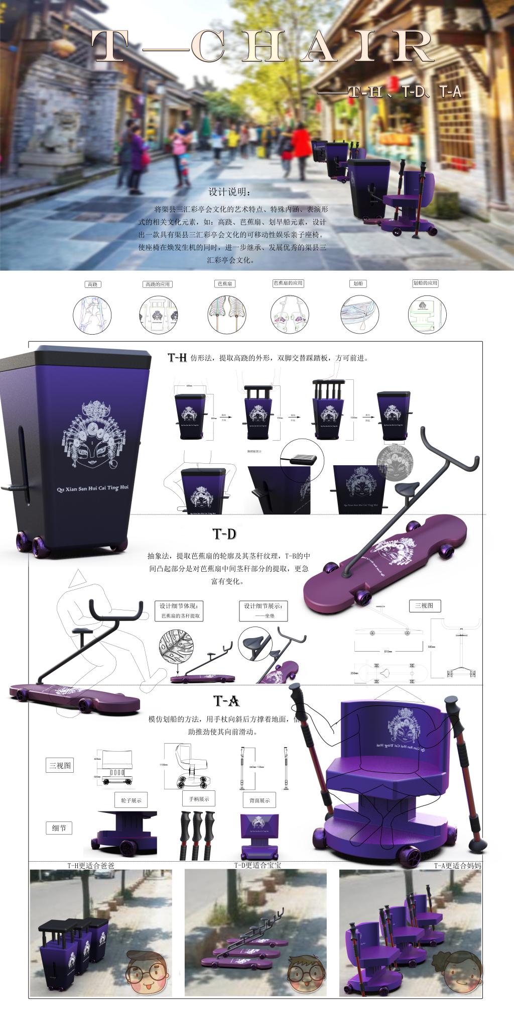 设计说明: 此作品是可移动性亲子娱乐座椅——T-chair;是渠县三汇彩亭会文化在座椅设计中的应用进行设计的。T-chair有三款座椅,分别为T-H,T-D,T-A;它融入了渠县三汇彩亭会文化的特殊内涵、艺术特征、表演方式;它主要运用于渠县三汇镇的过往游客和居民休息、娱乐;它不仅能给过往游客提供沿途的短暂休息、还能骑着它游玩、还能进行一场亲子间的骑速之比、更是对渠县三汇彩亭会文化的继承与发展。