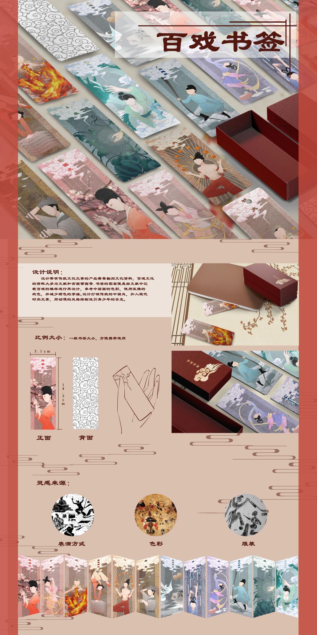 设计说明:设计带有传统文化元素的产品需要翻阅文化资料,百戏文化的资料大多为文献和古画壁画等.书签的图案便是由文献中记载百戏的模样进行再设计,参考戏曲文化中的上五色和下五色,使用淡雅的纯色,并且减少颜色的穿插。设计打破传统的中国风,加入现代时尚元素,用动漫的风格绘制吸引青少年的目光。