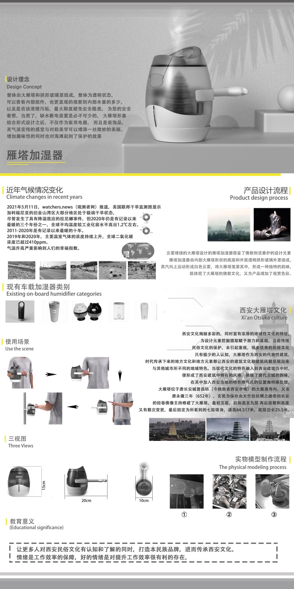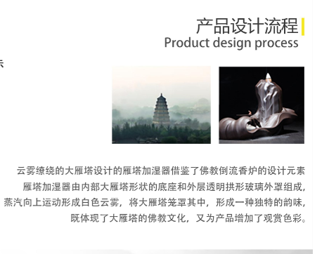 设计说明:基于大雁塔建筑外形和文化内涵,设计了雁塔加湿器,参考佛教“倒香流”设计,和佛教清净文化,考虑人体工程学原理,设计出既富传统文化特色,又具科技使用价值的雁塔加湿器。