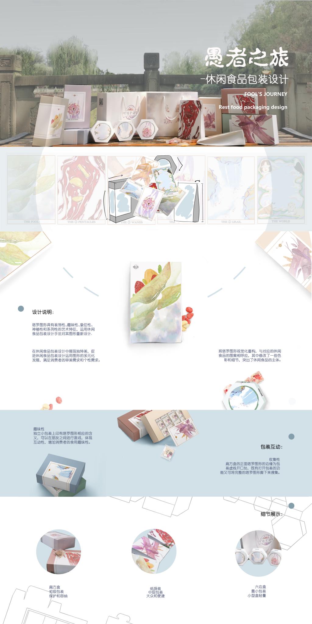 通过采用扁方盒,纸袋装,六边盒和独立小包装的分级包装的形式进行表现,笔者视觉化重构每一张塔罗图形与相对应的休闲零食进行包装设计,绘制出休闲食品的图案并与塔罗图案相协调,调整了一些色彩和细节。 “愚者”从开始到“世界”的结束经历了一个轮回,水果果干来到蔓越莓曲奇饼中进入了新世界。塔罗图形就像休闲食品一样,调剂着生活,为人们增添乐趣,使休闲食品包装设计更加多样化,体现塔罗图形的独特美,给消费者更多选择。