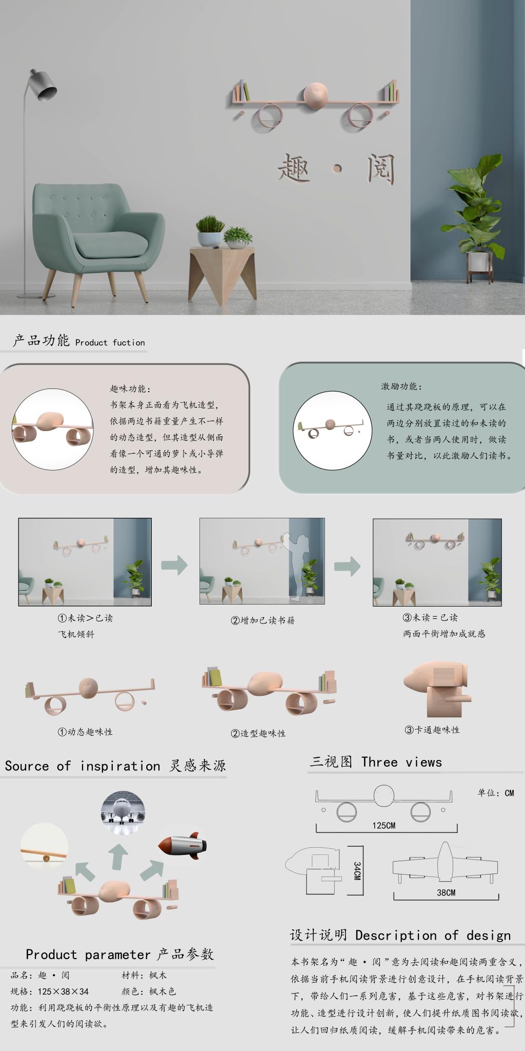 本书架名为“趣·阅”意为去阅读和趣阅读两重含义,依据当前手机阅读背景进行创意设计,在手机阅读背景下,手机又会带给人们一系列危害,基于这些危害,对书架进行功能、造型进行设计创新,使人们提升纸质图书阅读欲,让人们回归纸质阅读,减少手机阅读时间,以此缓解手机阅读带来的危害。