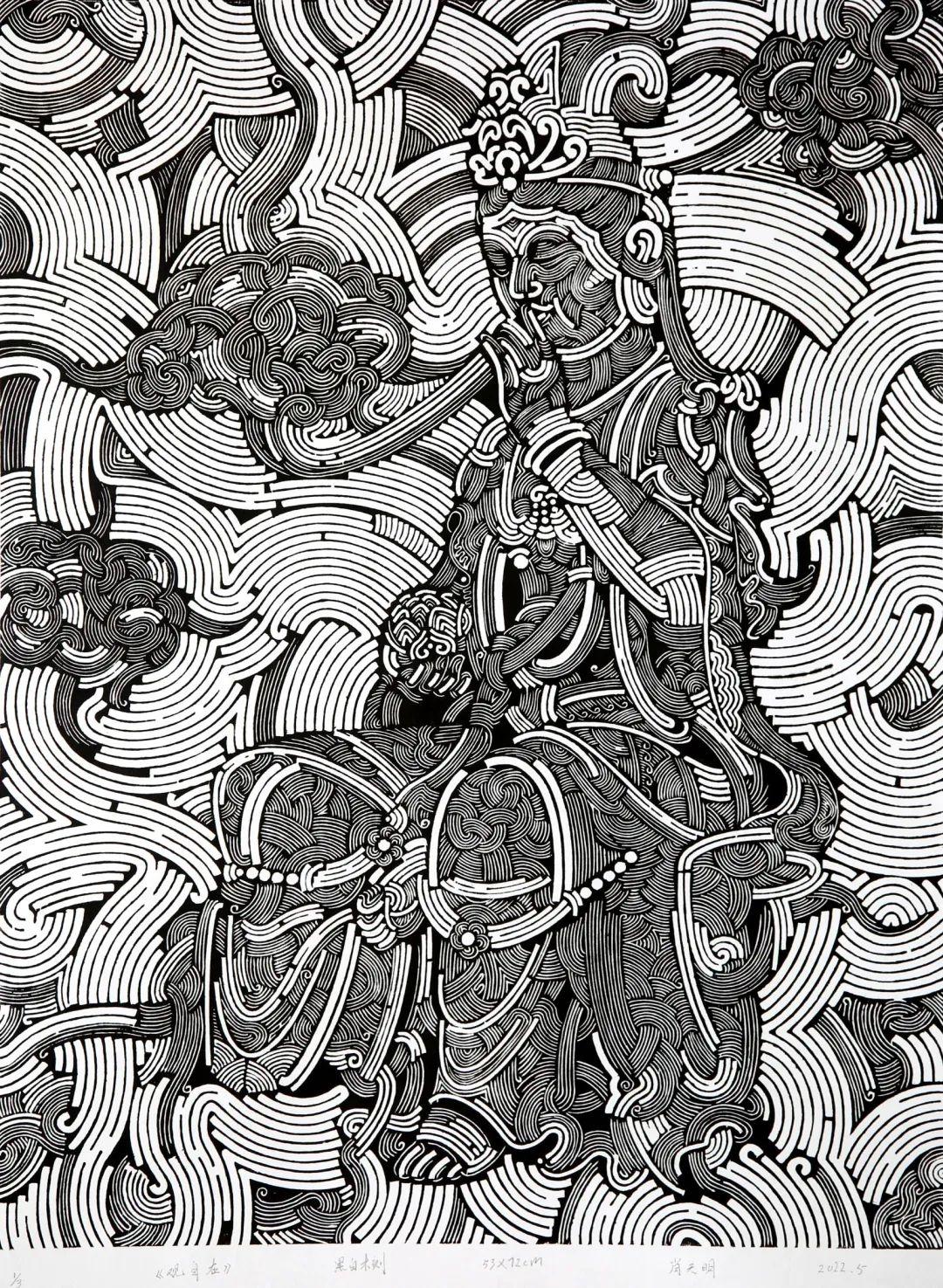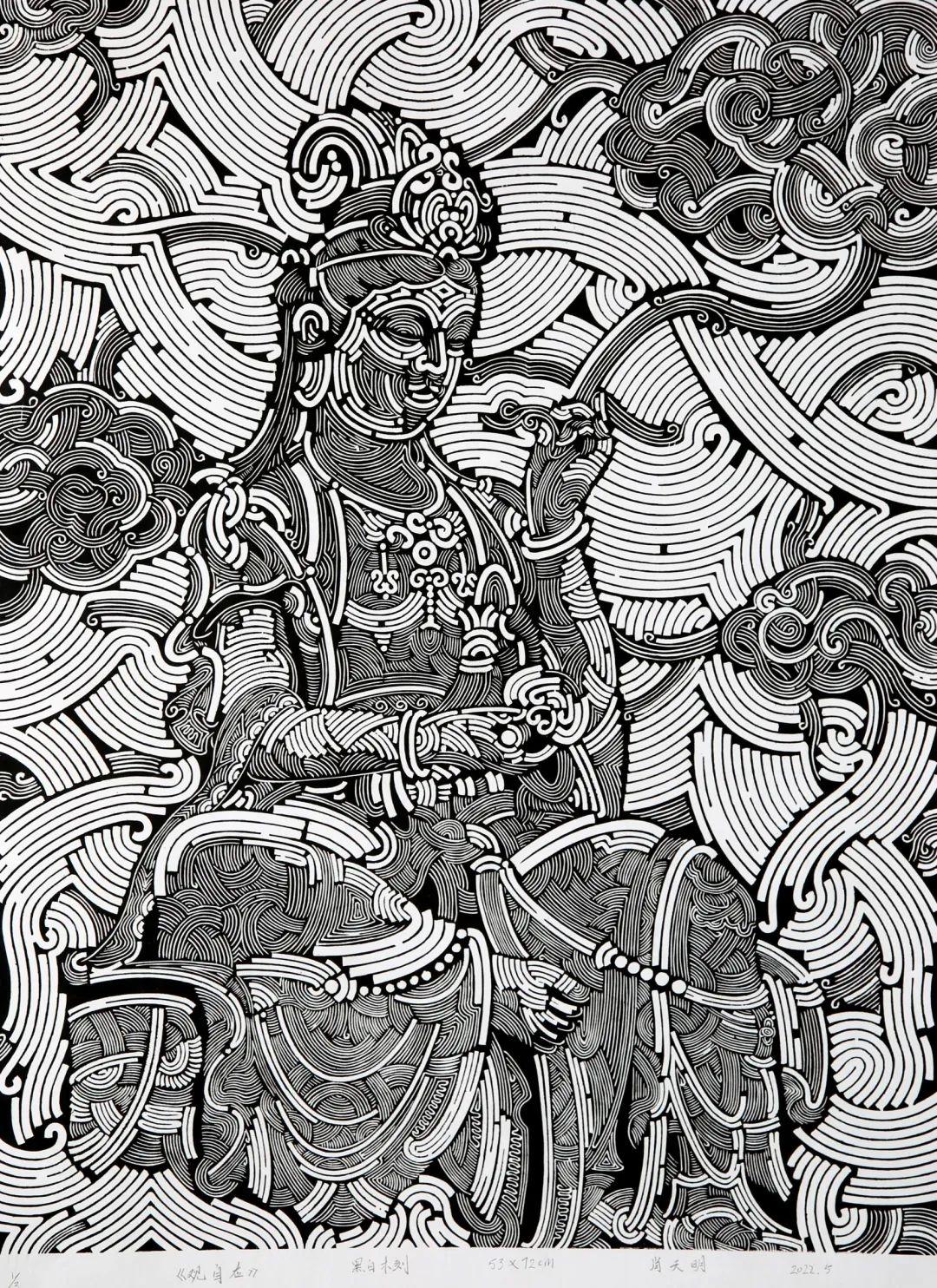 《五髻菩萨图》 宋兴朝 黑白木刻 33x83cm