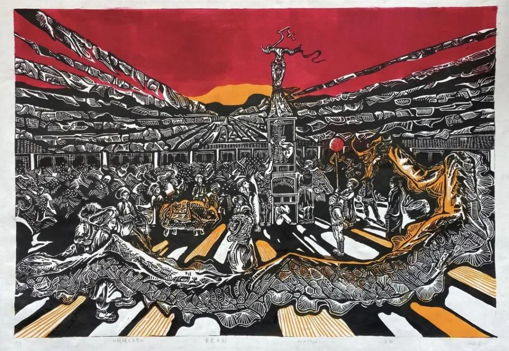 《硗碛上九节 》汪怡 套色木刻 52×77cm