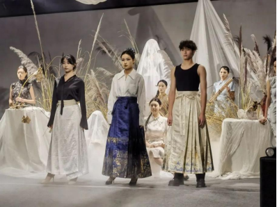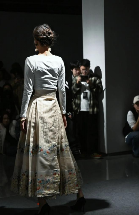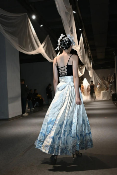 紧接着,充满东方之美的马面裙震撼登场。华丽的绸缎、精致的蕾丝以及复古的剪裁,重现了中世纪贵族的奢华风范。收腰的设计凸显出女性的柔美线条,宽大的裙摆随着模特的步伐摇曳生姿,金色和银色的丝线在灯光下闪烁,仿佛诉说着古老时代的辉煌故事