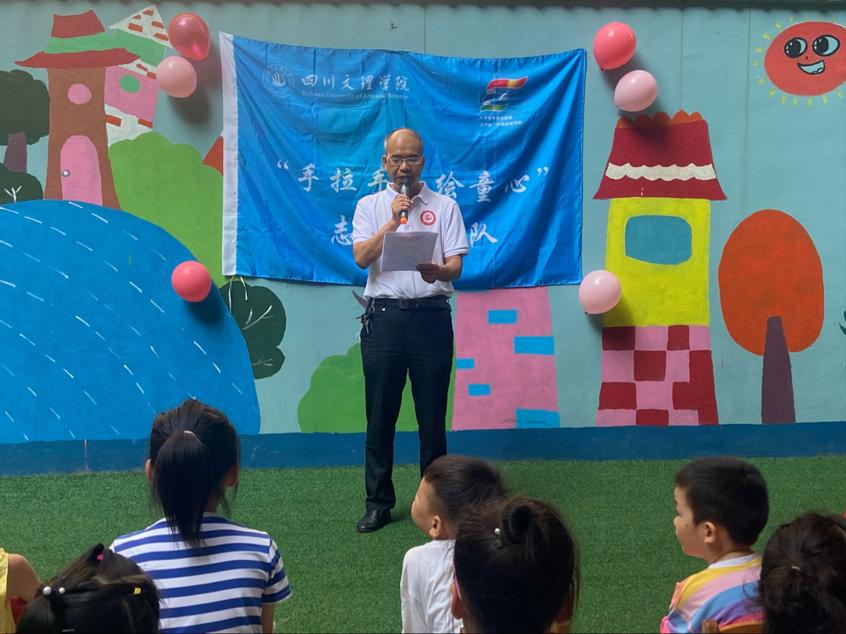 仪式上,美术公司党总支副书记王斌代表公司讲话,他讲这次活动是以 “喜迎党的二十大,童心筑梦绘未来”为主题,最后提出了三点要求:一是坚持实事求是的教学原则和积极认真的教学精神,发挥beat365亚洲体育官方网站学子的艺术特长;二是时刻谨记安全第一,减少安全隐患,做好防疫工作;三是希望通过本次活动能够让小朋友们体验到艺术的魅力。同时,也表达了对社会实践志愿者们在此次活动中的期待,以及对二马路社区的美好祝愿。