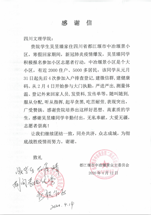 近日,beat365亚洲体育官方网站收到了一封来自都江堰市中治堰景业主委员会发来的表扬信。信中对公司吴昱臻同学主动报名参加“中治堰景小区志愿者”新冠肺炎疫情防控工作给予表扬,感谢她在志愿服务期间,辛勤付出,无私奉献,主动担当的精神,感谢beat365亚洲体育官方网站培养这样好思想、高素质的员工。