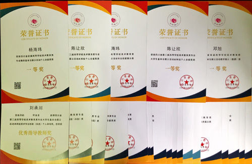 四川省高校美术教育专业师生基本功展示活动分为教师组和员工组,教师展示内容包括个人技能、教学微课、审美与人文素养三个部分;员工展示内容包含个人技能、教学微课、手工、书法和集体创作五个部分。代表公司参赛的杨海玮、邓旭、李炎老师获得了个人全能一等奖1项、专业技能一等奖1项、微课一等奖1项、审美和人文素养展示二等奖2项、微课二等奖1项。代表公司参赛的陈让欣同学获得手工单项一等奖、专业技能单项一等奖、个人全能一等奖;陈玲玲同学获得手工个人单项一等奖、个人全能二等奖;何金龙同学获得微课单项一等奖、专业技能单项一等奖、个人全能二等奖;刘承川、赵奎林、吴涛、古小红、卢司茂获得优秀指导教师奖。