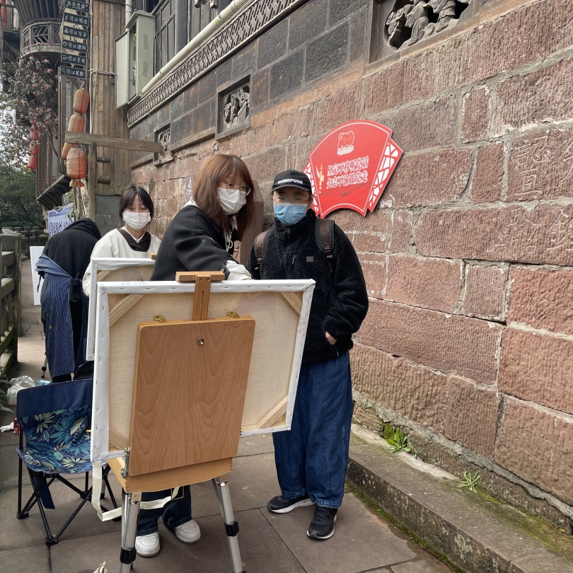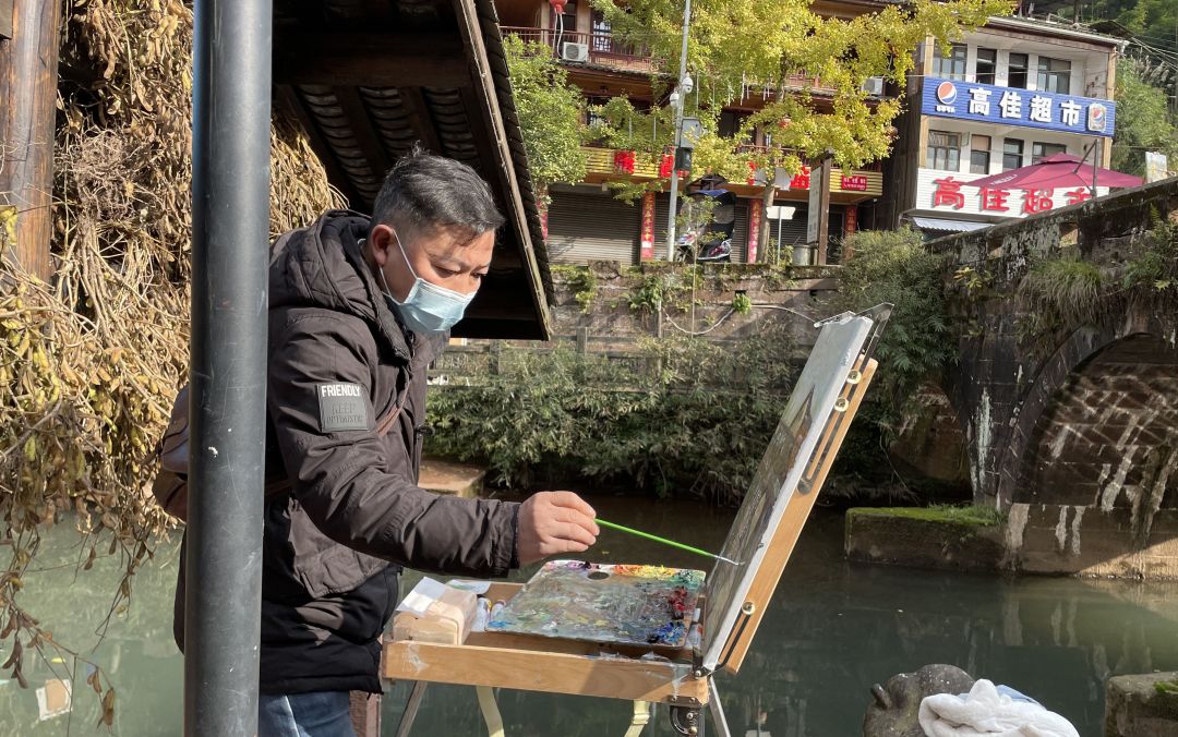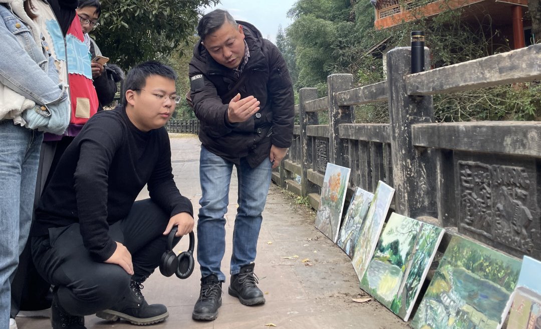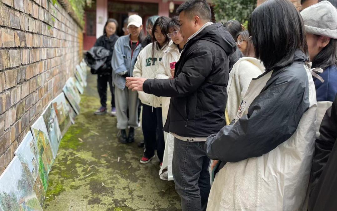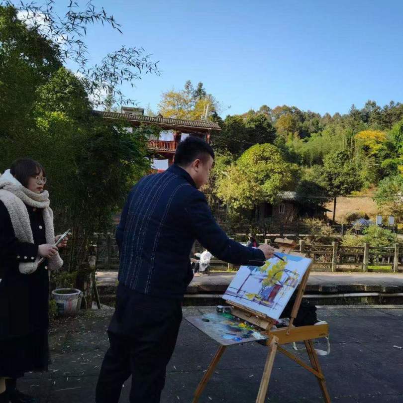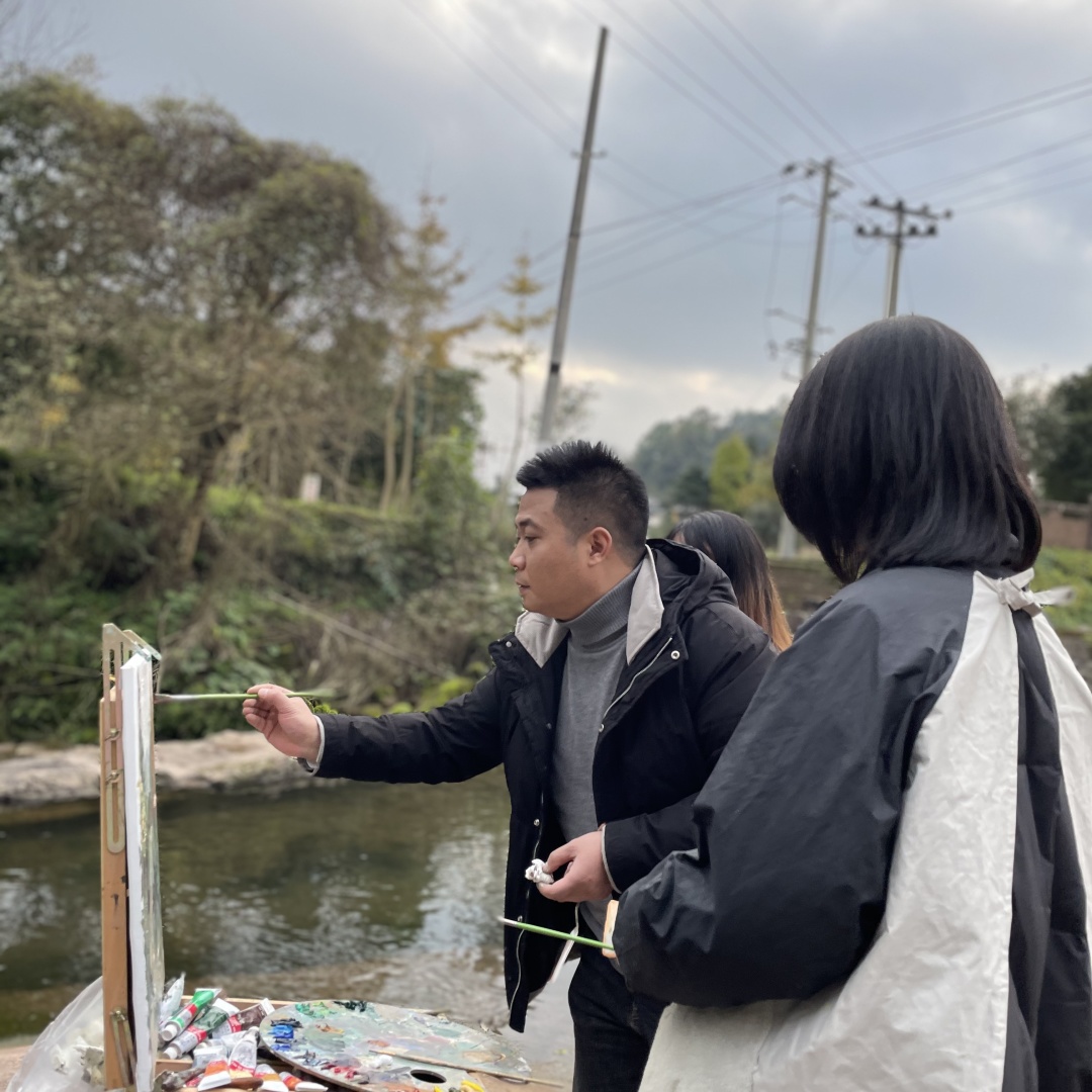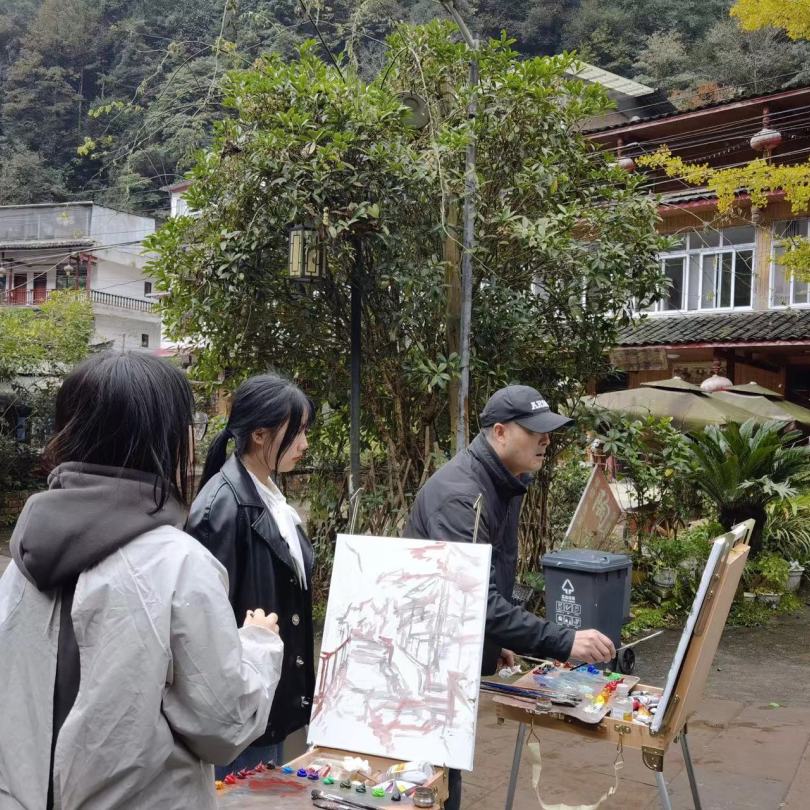 在教学过程中老师们带上画具做示范画,同时讲授油画风景写生要点。同学们按照老师的要求尽情地描绘上里古镇的自然人文风光,沉浸在艺术表达中。在同学们的绘画过程中老师们细心地对每位同学的写生作品进行指导。