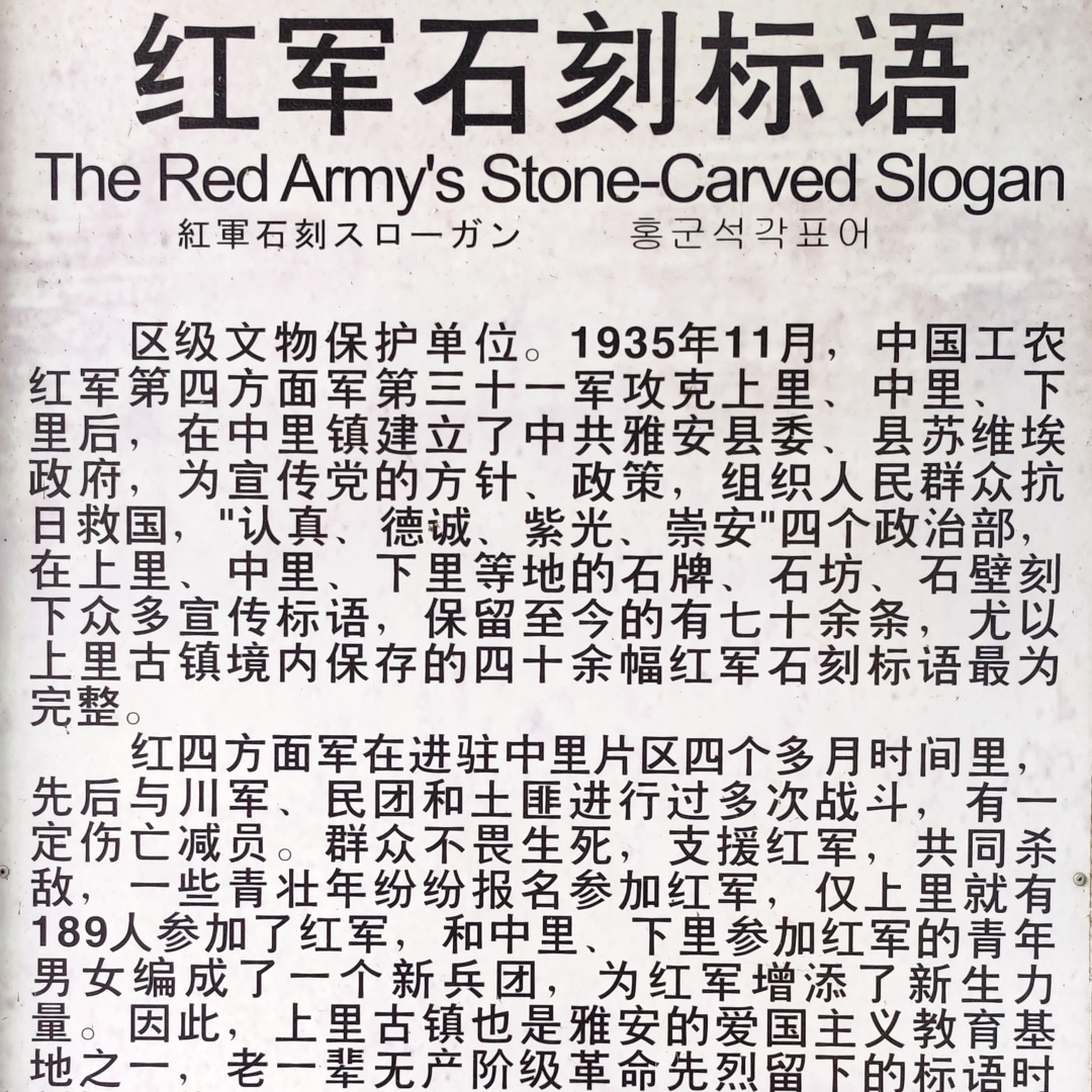 红军长征时,曾在上里古镇驻扎,红军为了宣传党的方针政策,在此刻下七十多幅标语。