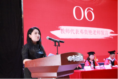 教师代表邓贵艳对公司2023届毕业生表示最真诚祝贺,她希望同学们左手握理想,右手坚强,做力所能及的事情,最后祝愿同学不畏生活的苟且,有远大的理想,保持对学习生活的热爱。