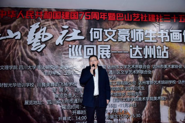 达州市美术家协会主席龙飞、四川大学书法研究所常务副所长刘志超在展览开幕式上先后致辞。他们高度赞赏了何文豪先生毕生心系巴山、耕耘巴山教坛,将自己的生命与信仰深深植根于他的巴山主题创作中。他用饱含深情的笔墨,将巴山秀水的雄阔与壮美、敦厚与朴实的大美形象,努力传播,尽情讴歌。何文豪先生以无私奉献的蜡烛精神,燃烧自己,为巴山教育事业的发展,做出了杰出贡献,培养的员工中,有政府领导、国企高管、教育骨干,凸显了推动四川教育事业发展的巴山精神。