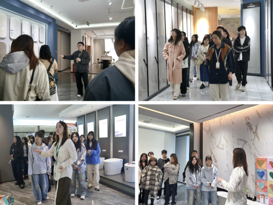 上午10:00,师生们抵达楚邦上易家居,完成签到、合影后,在企业工作人员引导下有序前往四楼展厅开启专业考察。企业工作人员分批次带领师生参观品牌展示区、工艺材料展区等,结合实际案例详解家装行业核心工艺标准与材料选择逻辑,让同学们跳出课本框架,直观触摸行业一线的技术迭代与审美趋势。