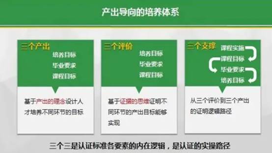 本次师范类专业认证,OBE是专业人才培养体系设定的原则性理念,即“产出导向的人才培养体系”,认证关注点可以概括为“三个三”。